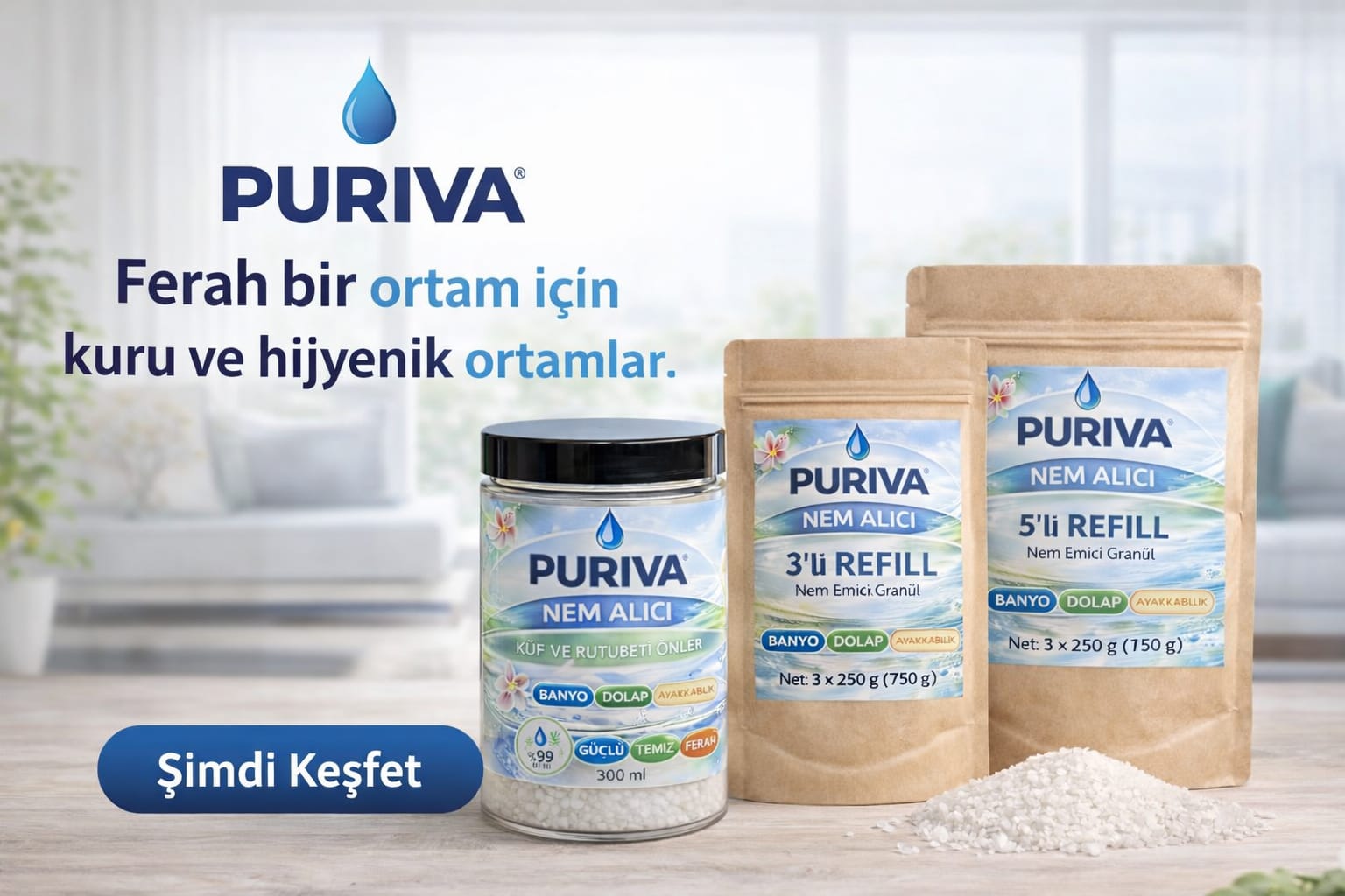 PURIVA Nem Alıcı Refill ile evinizde, dolaplarınızda ve kapalı alanlarda daha temiz ve ferah bir ortam sağlayın.